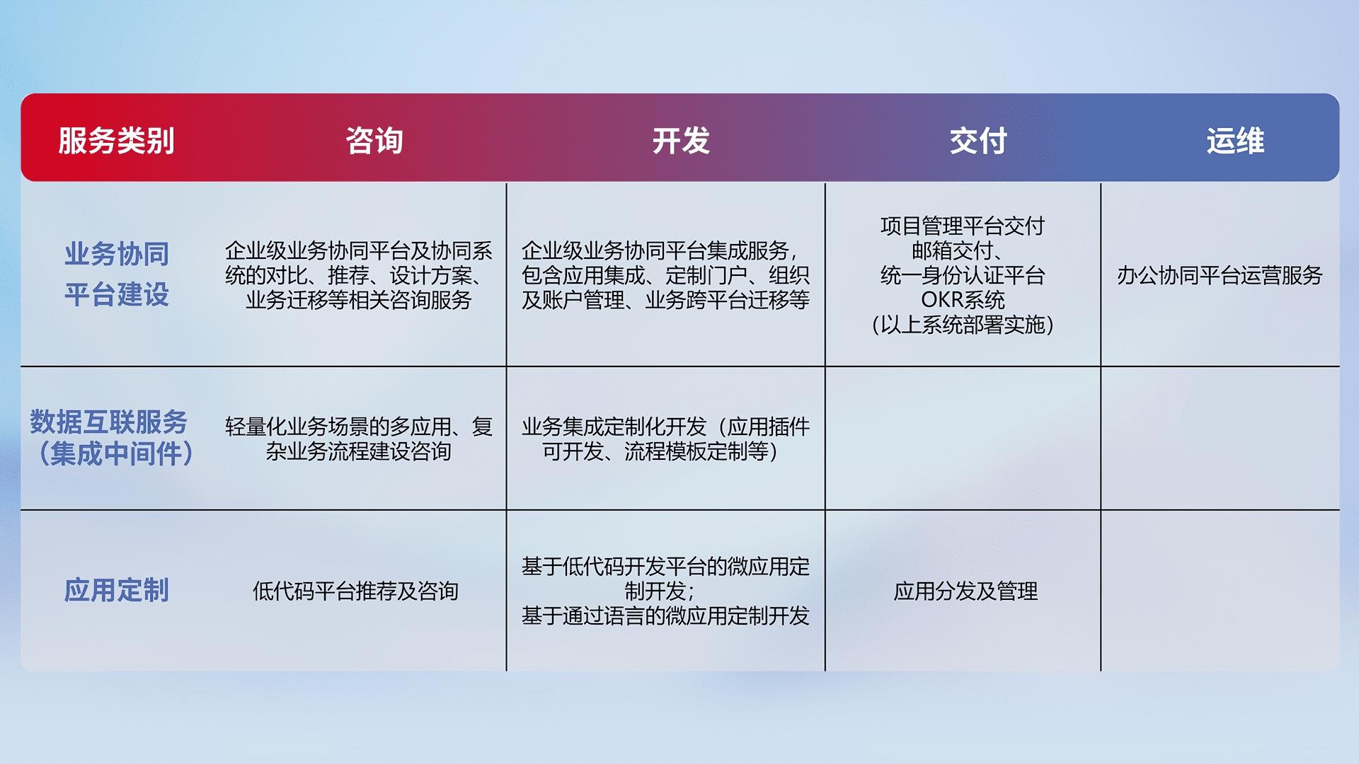针对钉钉、、、企微、、、、IDaas等平台级产品提供产品的规划、、、、方案、、交付、、、、定制化开发等服务,,,,实现如统一协同办公、、智能客户服务、、、混合会议管理、、智能数据查询、、、等业务场景,,,实现数字化转型。。