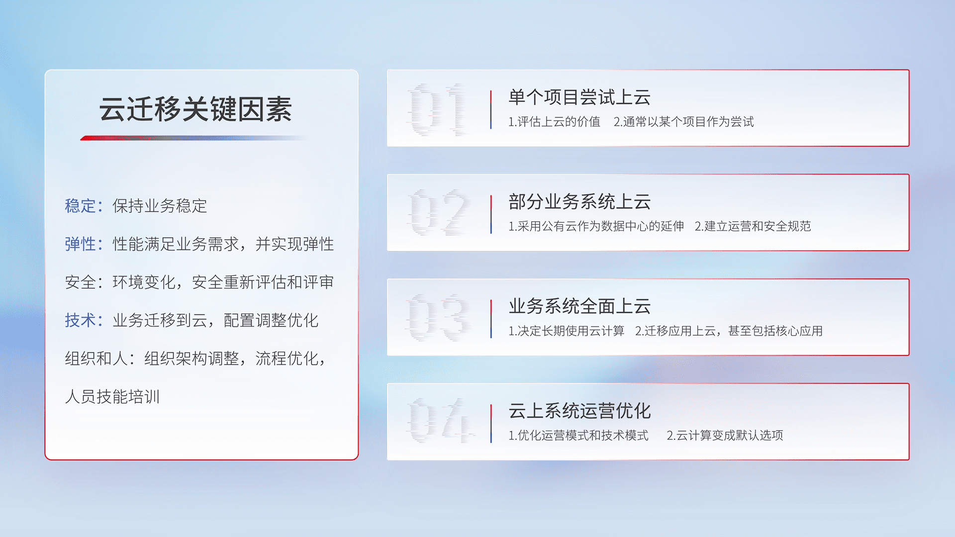 结合实际业务,,,从规划设计、、云平台选型、、、云原生改造、、、、数据迁移、、、、集成交付,,迁移全过程为客户识别最佳上云路径,,,,做好风险识别管理,,,设计网络架构、、、、身份权限、、、安全审计合规、、、操作审计、、日志审计、、、、监控告警策略、、多站点容灾设计等,,,,对云上基础设施进行整体规划,,,,提升IT治理水平,,,,以满足弹性、、高可用、、高性能的需求。。。。