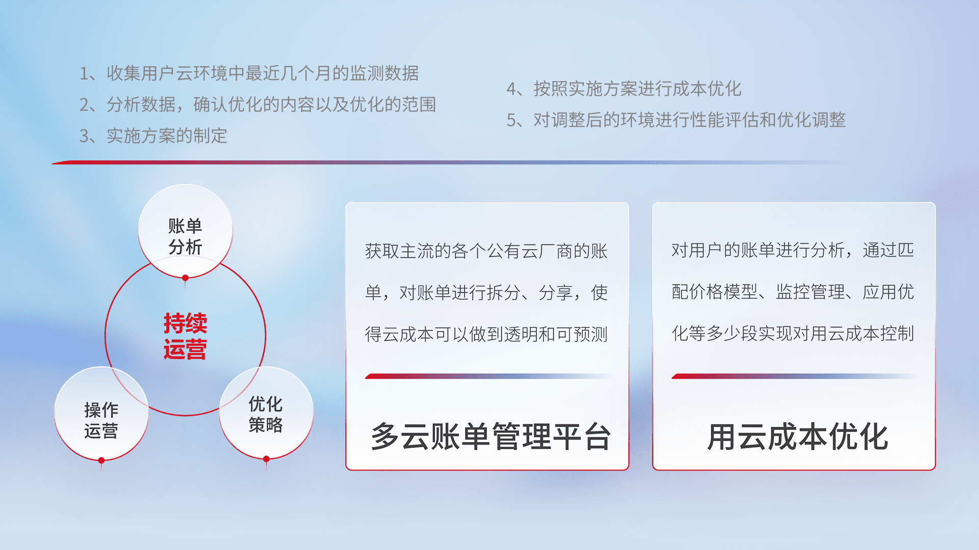 通过多云纳管,,以统一的资源数据模型把客户的云资源进行抽象和封装,,,进而实现对多云资源的统一操作,,,保障云资源管理的可靠性、、、、稳定性与可用性。。。。量身定制化运维内容,,配置、、、、开发运维、、补丁管理、、备份、、监控、、认证和访问管理、、审计和日常巡检等,,保障在用云过程中的可靠度,,,,稳定度以及高可用率。。。